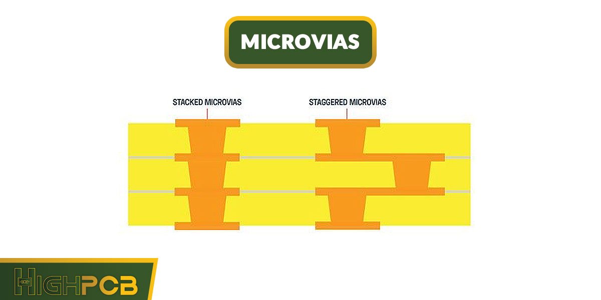Microvias are small-diameter vias typically created using laser drilling techniques. They are used in HDI PCBs to connect adjacent layers and can be categorized into different types based on their layout and stacking.